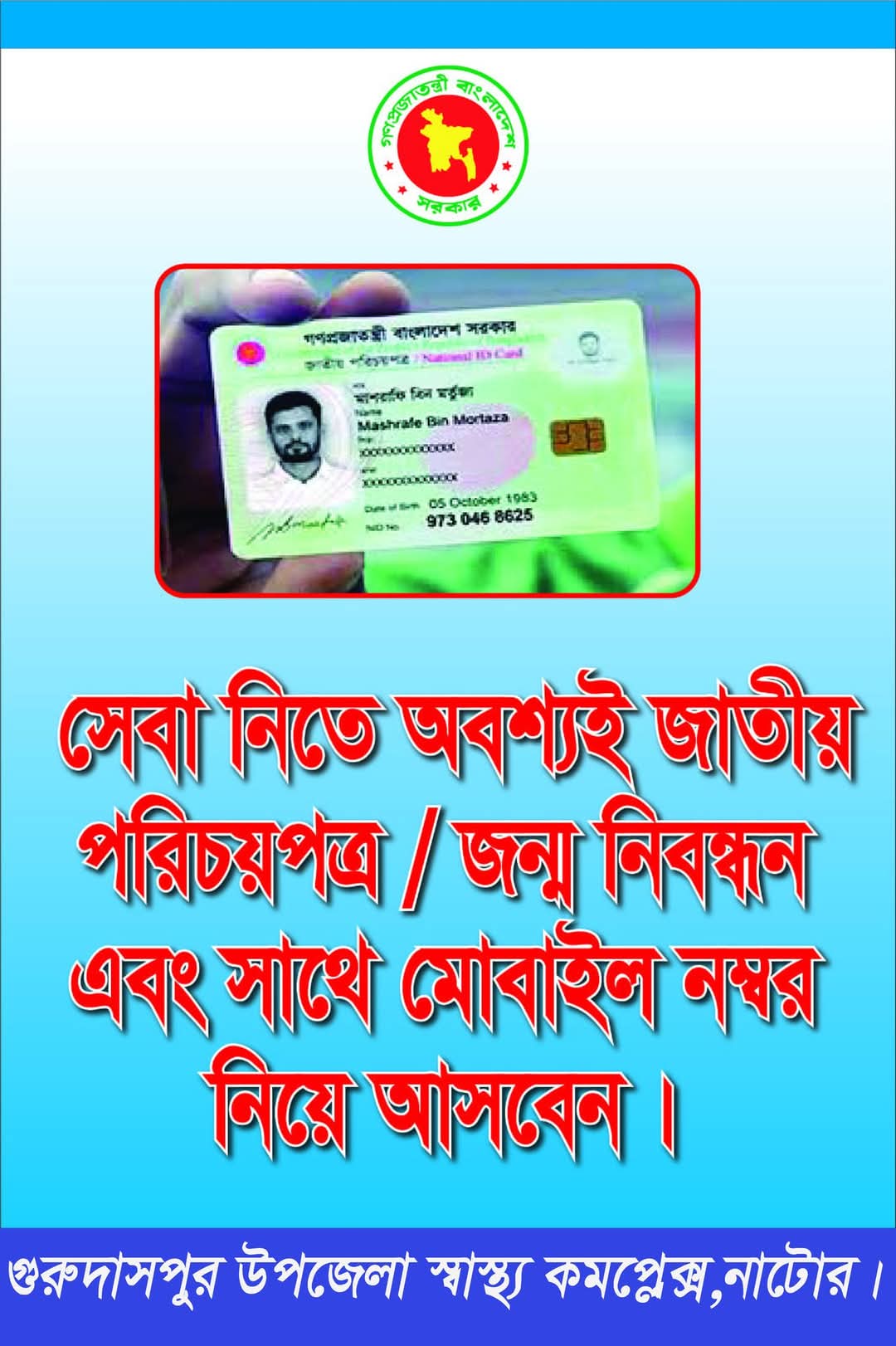 উপজেলা স্বাস্থ্য কমপ্লেক্স, গুরুদাস্পুর, নাটোর- এ সেবা নিতে আসা সকল জনসাধারণকে বিশেষভাবে অনুরোধ করা হচ্ছে -সরকারী হাসপাতালে সেবা নেওয়ার জন্য সাথে করে 𝐍𝐈𝐃 𝐂𝐚𝐫𝐝/Online𝐁𝐢𝐫𝐭𝐡 𝐜𝐞𝐫𝐭𝐢𝐟𝐢𝐜𝐚𝐭e নিয়ে আসবেন ।